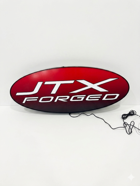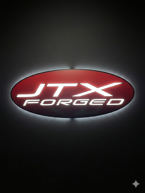 Illuminate your workspace with this striking JTX FORGED light-up shop sign. Perfect for your retail spaces, garages, man caves, she sheds, or any room you want to show your JTX fan support. This sign commands attention with a bold, glowing presence. Measures 30.5"L x 12"H x 3.5"W. Includes AC adapter for convenient installation. Durable aluminum frame construction ensures long-lasting durability and a professional finish that complements any space.